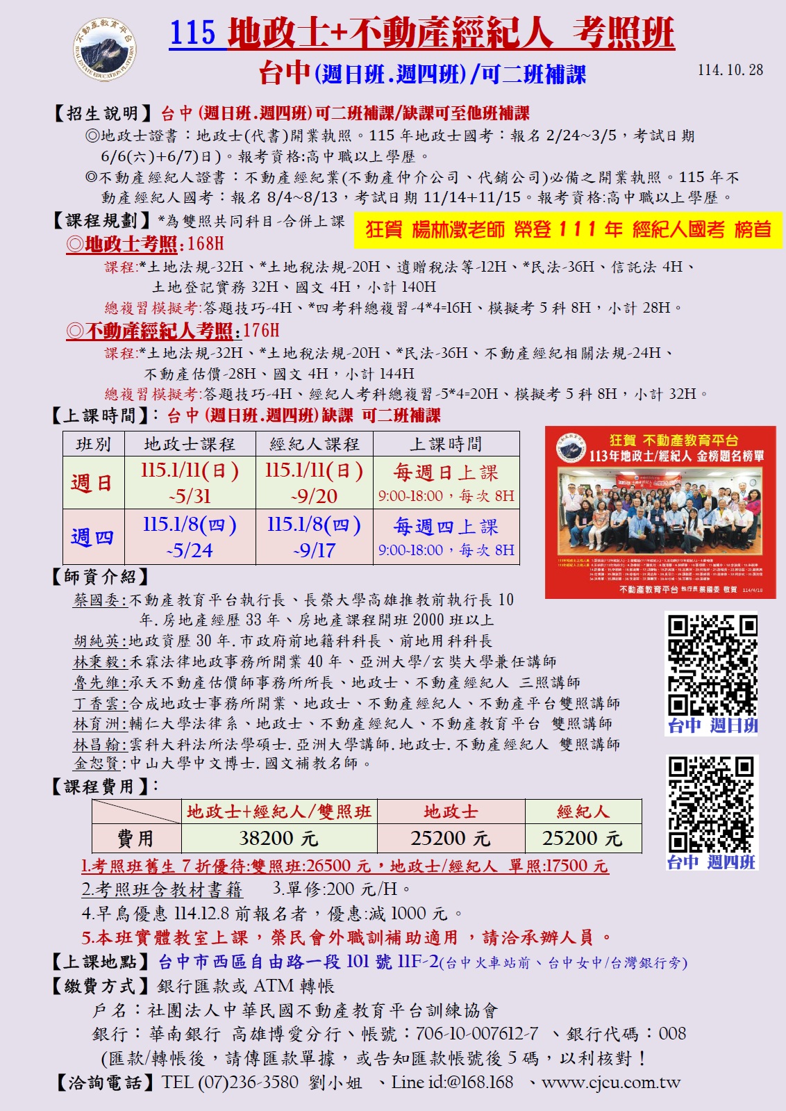 台中115.1/11-B351【115年地政士+不動產經紀人】週日 自費考照班(115.1/11起