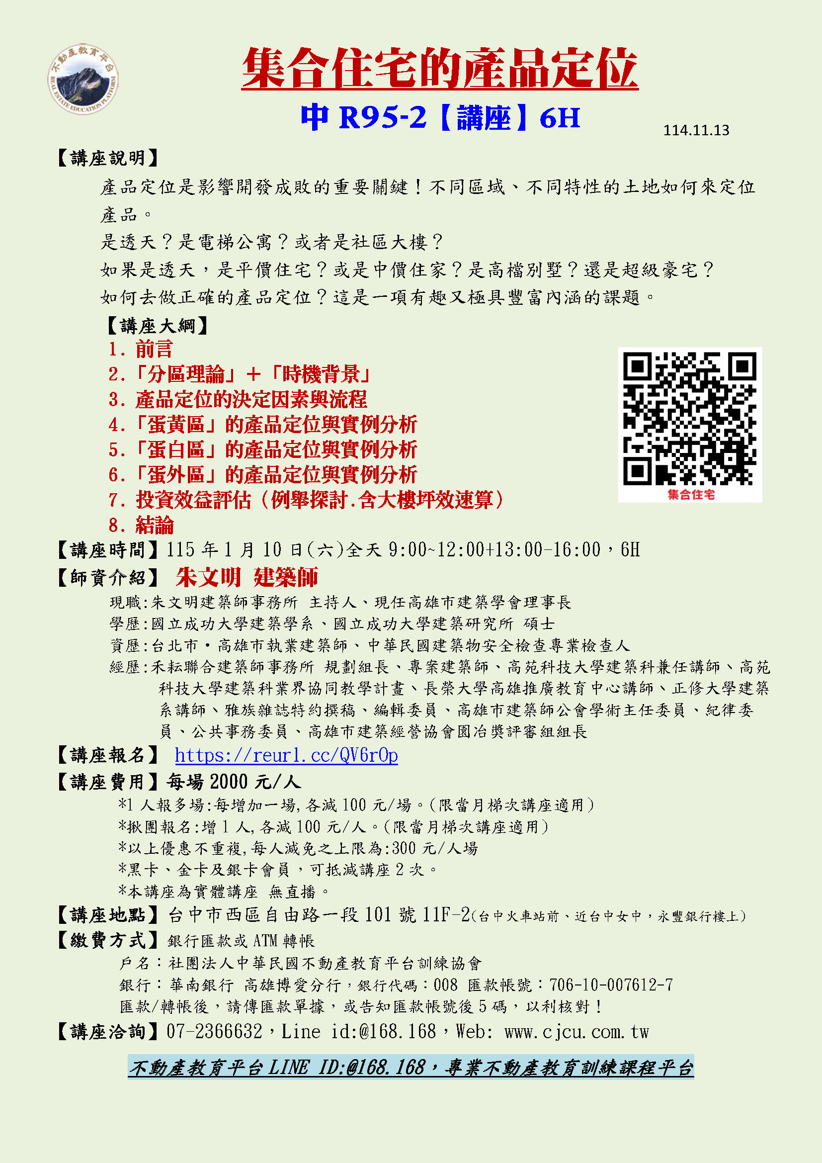 台中1/10週六-R95集合住宅的產品定位/2期-朱文明建築師(1/10全天)6H