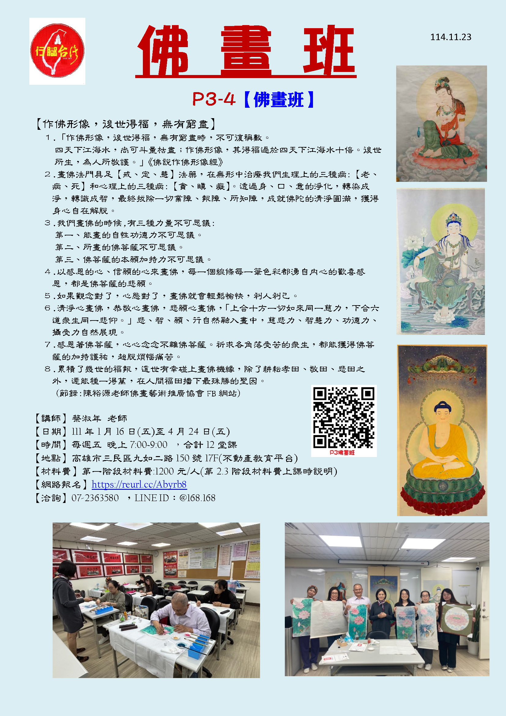 1/16週五夜P3-4佛畫班-蔡淑年 老師 1/16~4/24晚上7~9點2H/次*12=24H