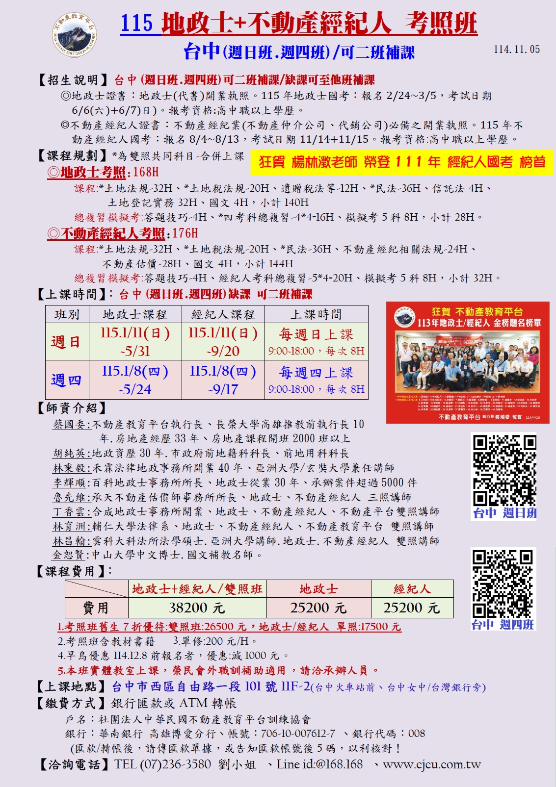 台中115 地政士+不動產經紀人 考照班 台中(週日班.週四班)/可二班補課 . 【招生說明】 台中(週日班.週四班)可二班補課/缺課可至他班補課 *地政士證書:地政士(代書)開業執照。115年地政士國考:報名2/24~3/5,考試日期6/6(六)+6/7)日)。報考資格:高中職以上學歷。 *不動產經紀人證書:不動產經紀業(不動產仲介公司、代銷公司)必備之開業執照。115年不動產經紀人國考:報名8/4~8/13,考試日期11/14+11/15。報考資格:高中職以上學歷。 【課程規劃】 *地政士考照:168H 課程:*土地法規-32H、*土地稅法規-20H、遺贈稅法等-12H、*民法-36H、信託法4H、土地登記實務32H、國文4H,小計140H 總複習模擬考:答題技巧-4H、*四考科總複習-4*4=16H、模擬考5科8H,小計28H。 *不動產經紀人考照:176H 課程:*土地法規-32H、*土地稅法規-20H、*民法-36H、不動產經紀相關法規-24H、不動產估價-28H、國文4H,小計144H 總複習模擬考:答題技巧-4H、經紀人考科總複習-5*4=20H、模擬考5科8H,小計32H。 *為雙照共同科目-合併上課 . 【班別及報名】: 台中(週日班.週四班)缺課 可二班補課 *週日班:115.1/11(日)開班 https://reurl.cc/MM7N54 . *週四班:115.1/8(四)開班 https://reurl.cc/vKnWxL . 【師資介紹】 *蔡國委:不動產教育平台執行長、長榮大學高雄推教前執行長10年.房地產經歷34年 *胡純英:地政資歷30年.市政府前地籍科科長、前地用科科長 *林秉毅:禾霖法律地政事務所開業40年、亞洲大學/玄奘大學兼任講師 *魯先維:承天不動產估價師事務所所長、地政士、不動產經紀人 三照講師 *李輝順:百科地政士事務所所長、地政士從業30年、承辦案件超過5000件、不動產經紀人 *丁香雲:合成地政士事務所開業、地政士、不動產經紀人、不動產平台雙照講師 *林育洲:輔仁大學法律系、地政士、不動產經紀人、不動產教育平台 雙照講師 *林昌翰:雲科大科法所法學碩士.亞洲大學講師.地政士.不動產經紀人 雙照講師 *金恕賢:中山大學中文博士.國文補教名師。 . 【課程費用】: *經紀人+地政士 雙照班: 38200元 *地政士考照班168H: 25200元。 *經紀人考照班176H: 25200元。 *考照班舊生7折優惠,請洽承辦人員。 *早鳥: 114.12.8前報名費用優待-1000元。 *考照班含教材書籍 *單修:200元/H。 *榮民補助方案,請洽承辦人員。 . 【上課地點】 台中市西區自由路一段101號11F-2(台中火車站前、台中女中/台灣銀行旁) 【繳費方式】銀行匯款或ATM轉帳 戶名:社團法人中華民國不動產教育平台訓練協會 銀行:華南銀行 高雄博愛分行、帳號:706-10-007612-7 、銀行代碼:008 (匯款/轉帳後,請傳匯款單據,或告知匯款帳號後5碼,以利核對! 【洽詢電話】 TEL (07)236-3580 劉小姐 Line id:@168.168 www.cjcu.com.tw |