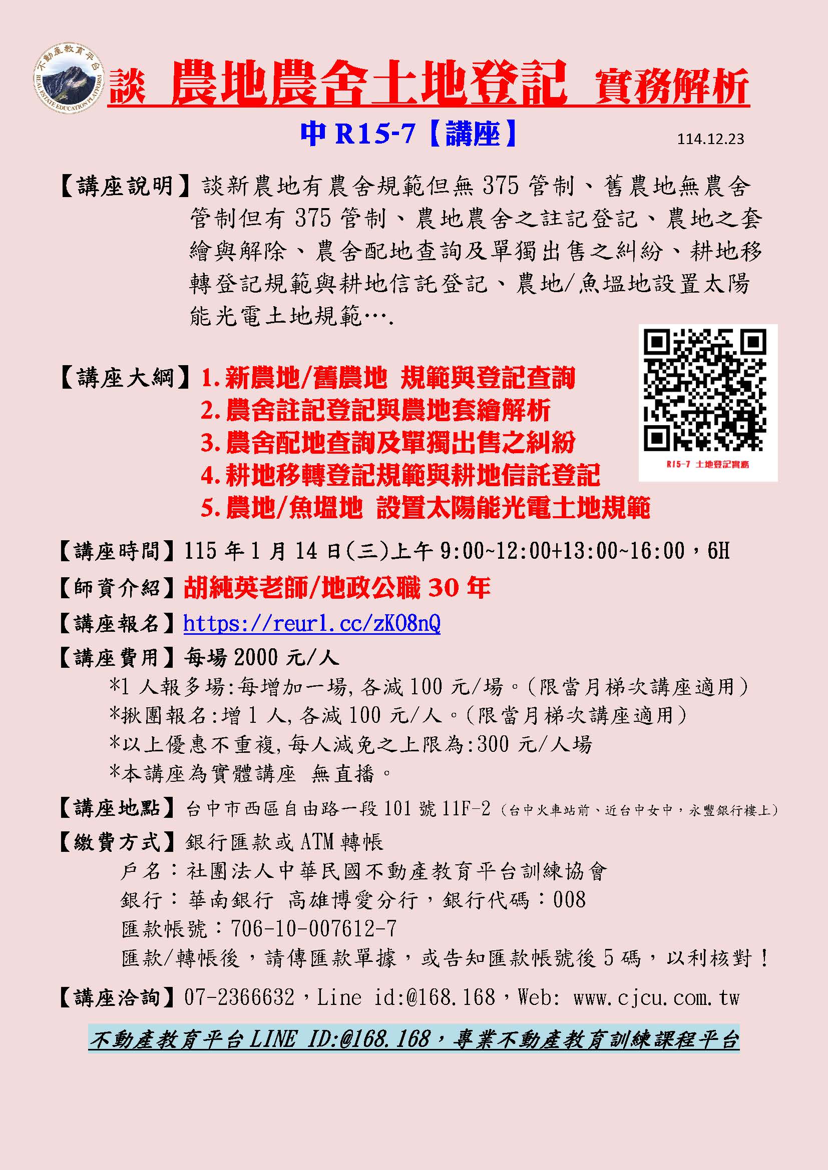 台中1/14週三-R15談農地農舍土地登記實務解析7期-胡純英老師(1/14全天)-6H