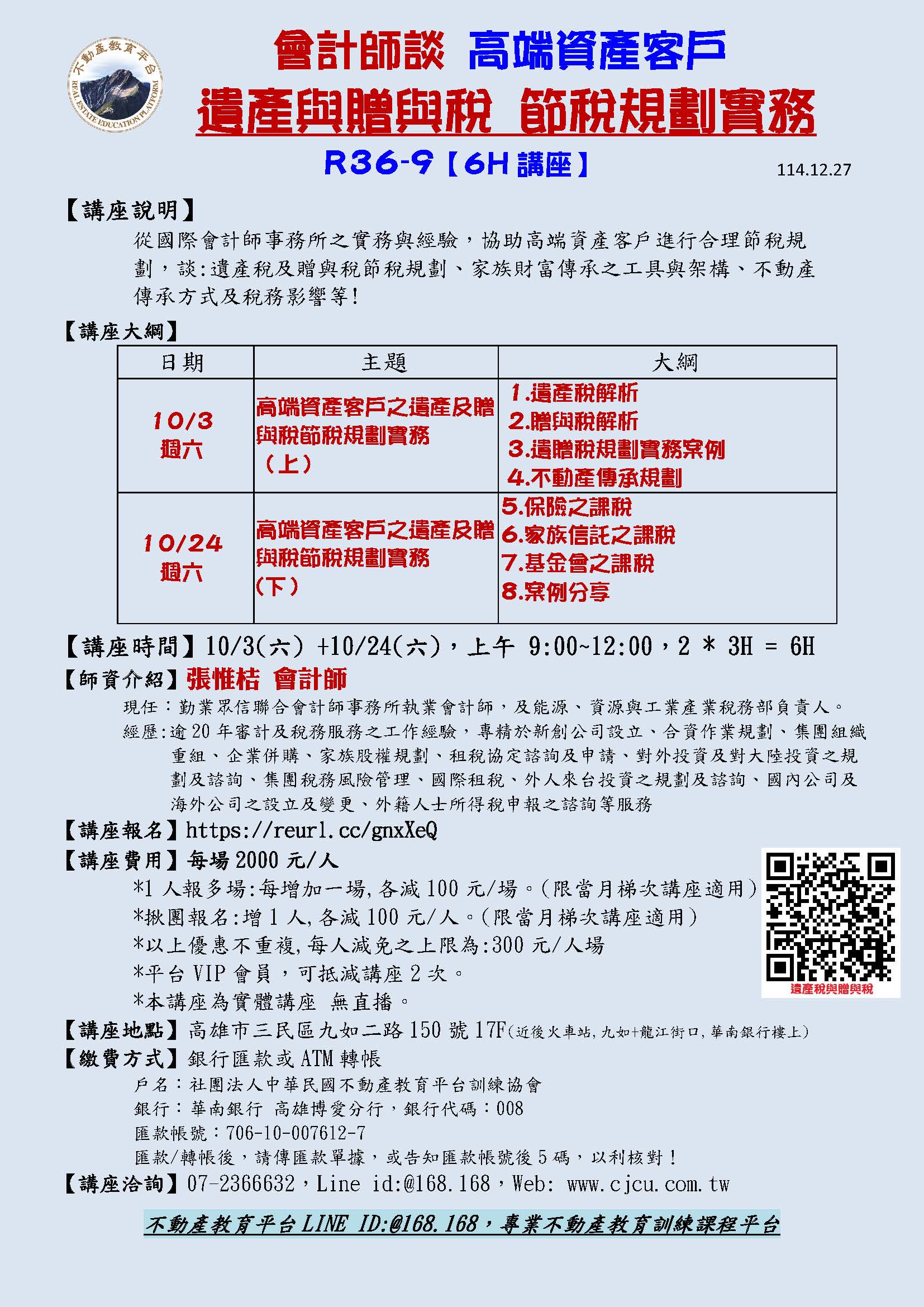10/3早上R36遺產稅與贈與稅 節稅規劃/9期(10/3+10/24週六早上9-12)-張惟桔會計