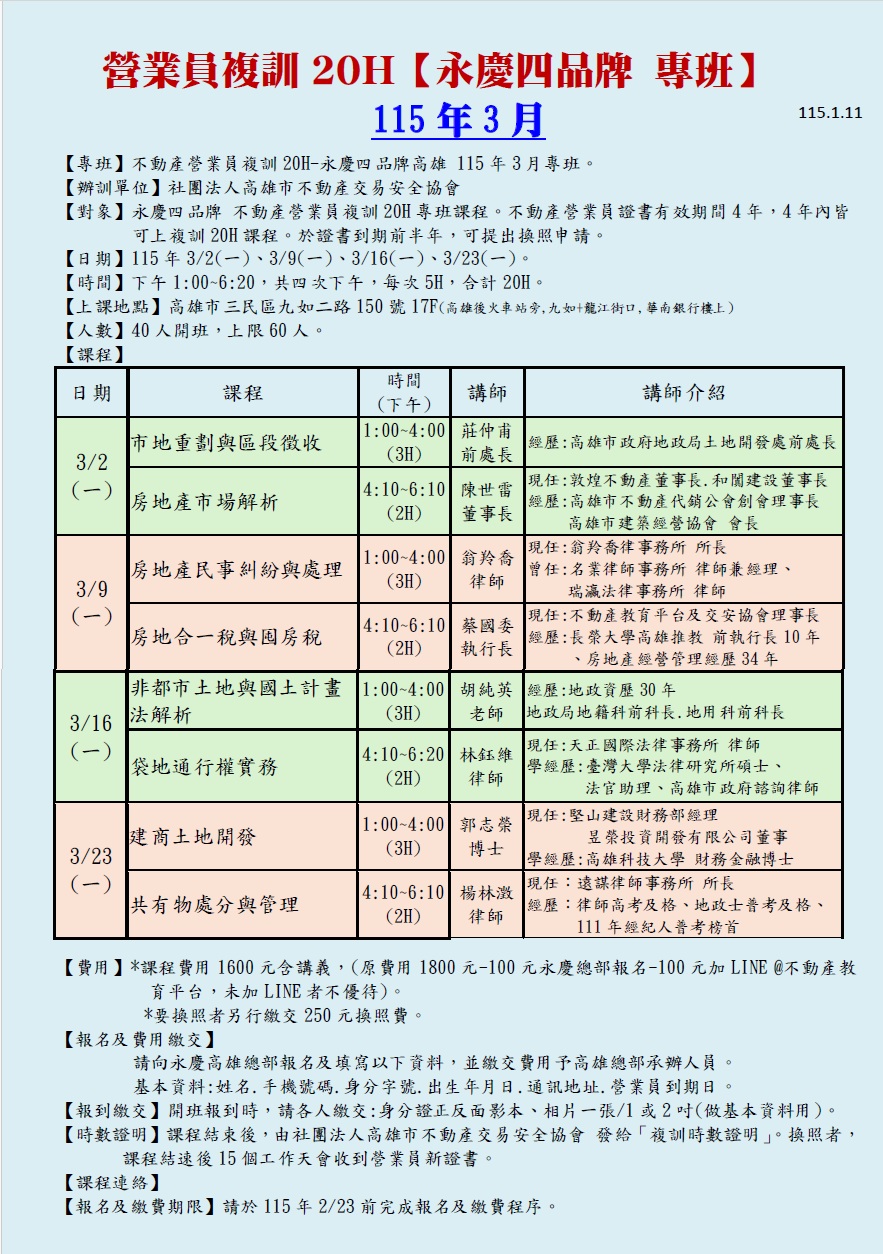 3/2營業員複訓20H/永慶四品牌專班(3/2.9.16.23 四個下午)