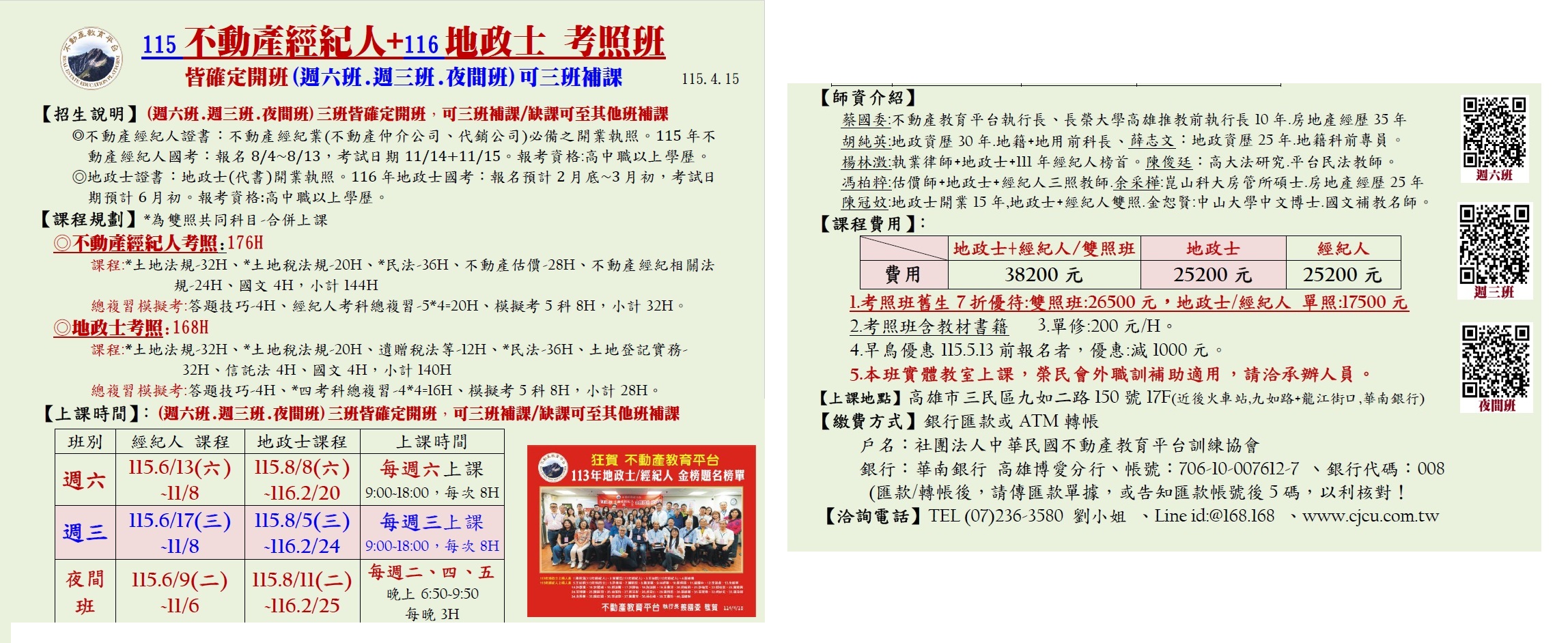 4/28高雄-B154二產高-不動產經紀人專業班(週二)4/28-8/11