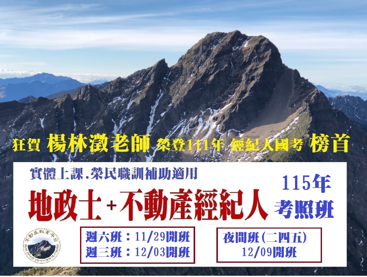 12/9 B3412【115年地政士+不動產經紀人】夜間自費考照班(114.12/9 每週二四五晚上