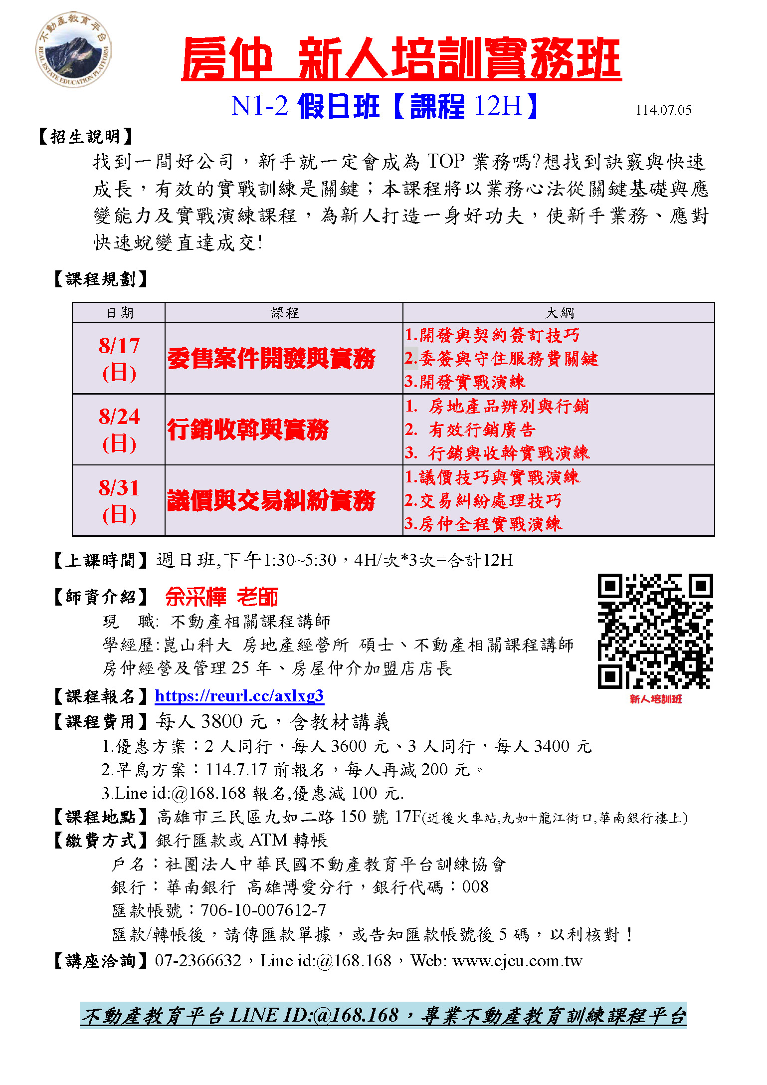 8/17假日N1 房仲 新人培訓實務班/2期-(8/17+8/24+8/31週日下午)余采樺-12H