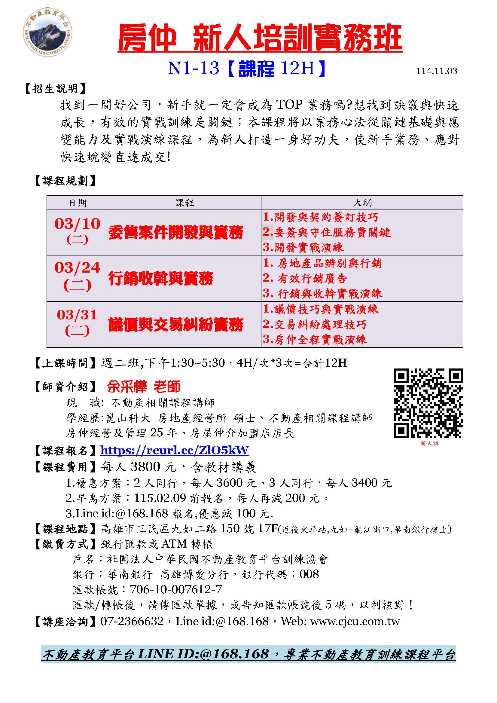 3/10下午 N1 房仲 新人培訓實務班/13期(3/10+3/24+3/31週二)余采