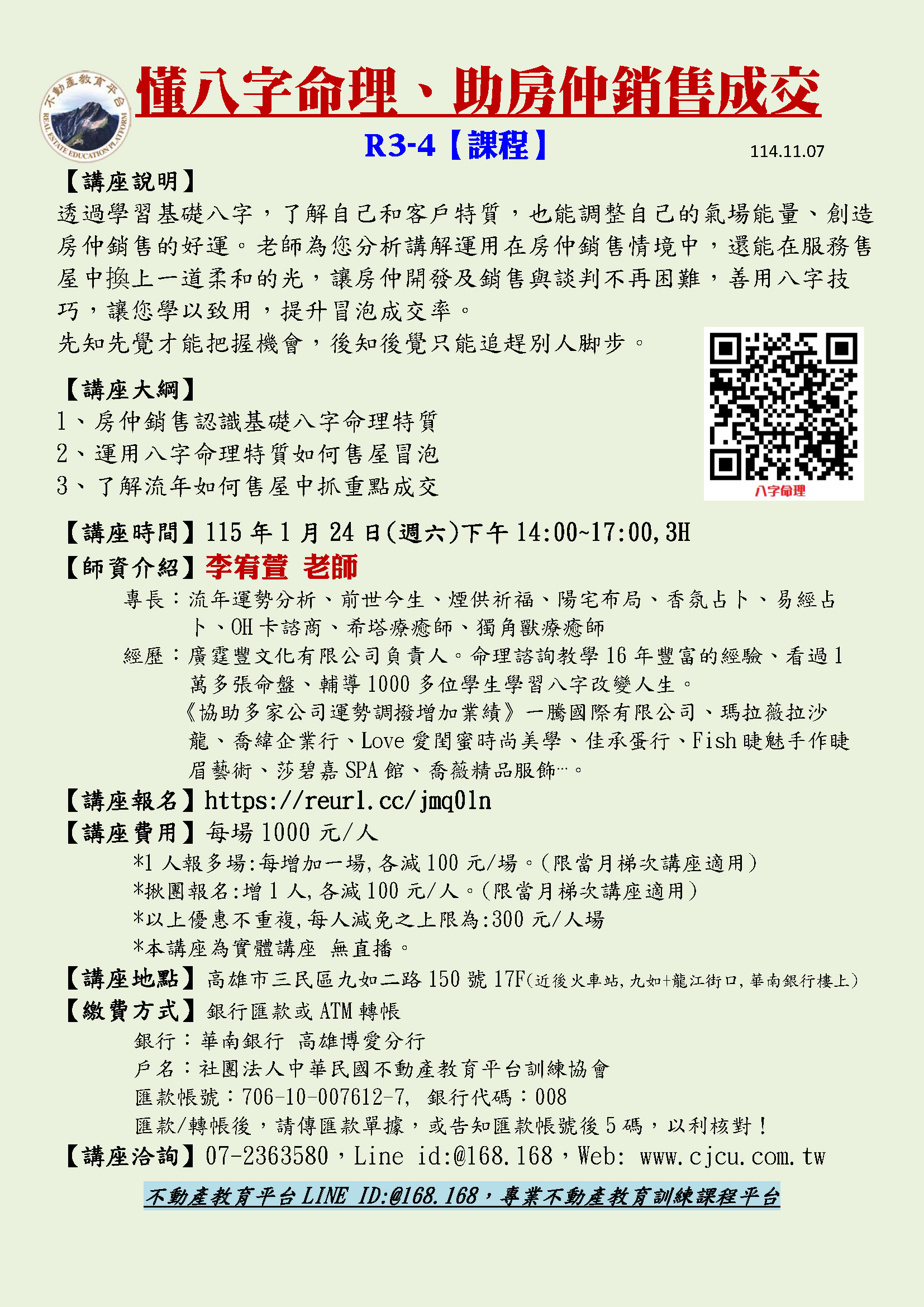 1/24下午R3-4懂八字命理、助房仲銷售成交/4期(週六下午)李宥萱 老師