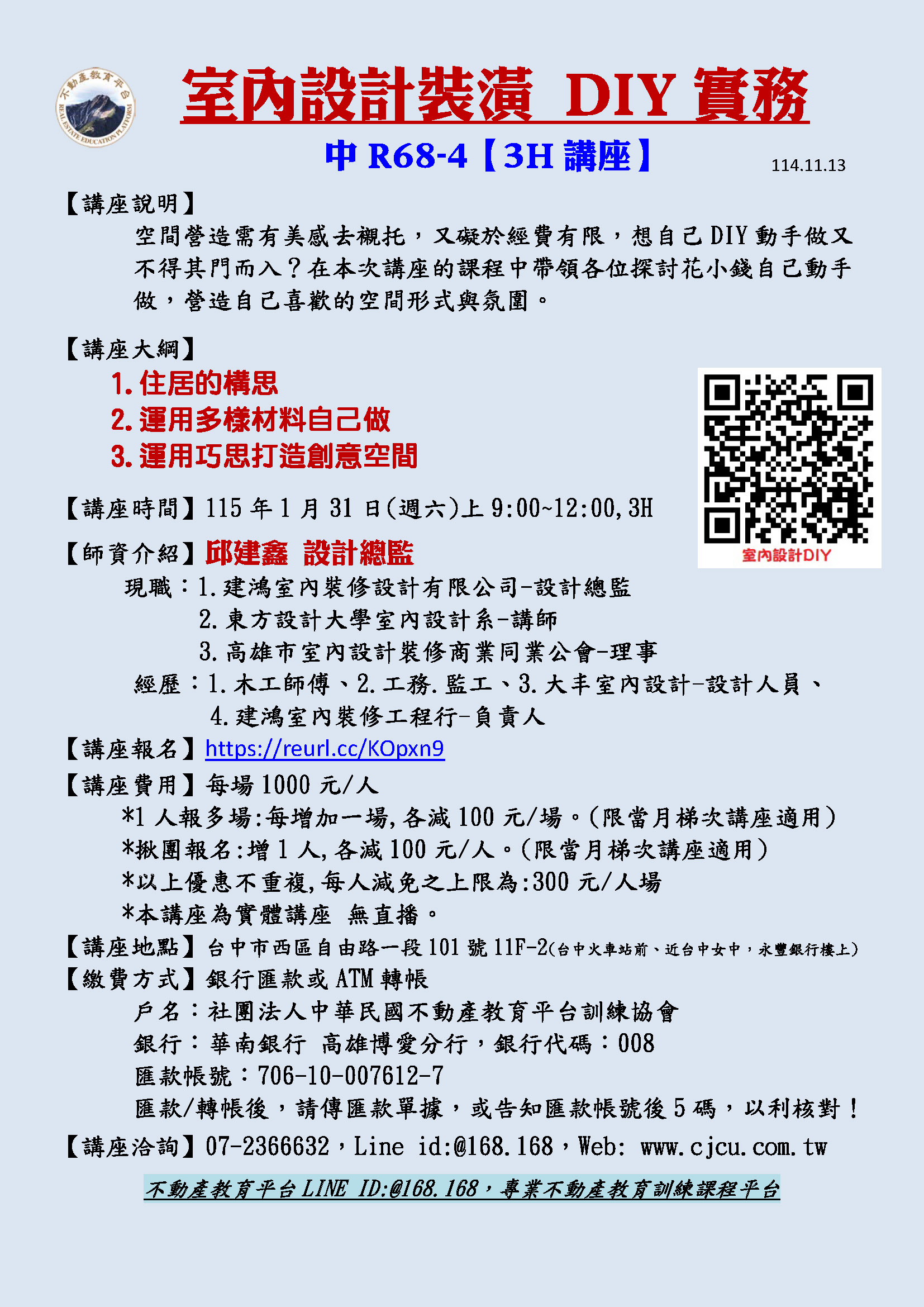 台中1/31上午-R68 室內設計裝潢 DIY實務/4期(1/31週六上午)邱建鑫 設計總監