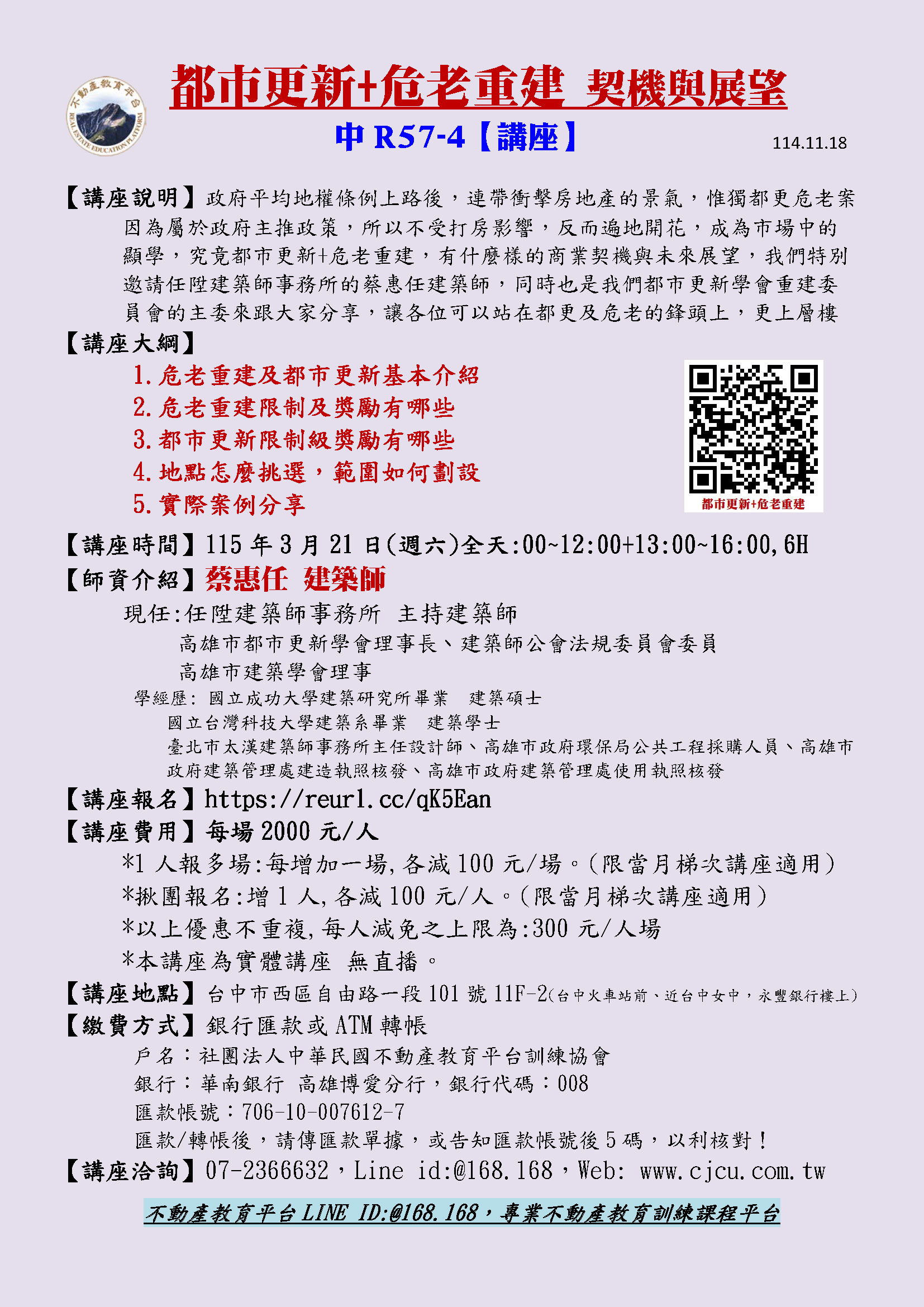 台中3/21週六-R57都市更新+危老重建 契機與展望/4期-蔡惠任老師(3/21全天)6H