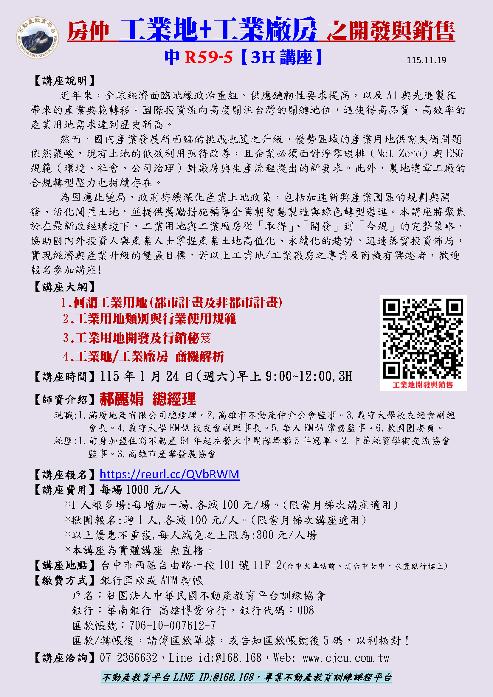 台中1/24上午R59-5談 工業地工業廠房 之開發與銷售-郝麗娟總經理(1/24週六上午)