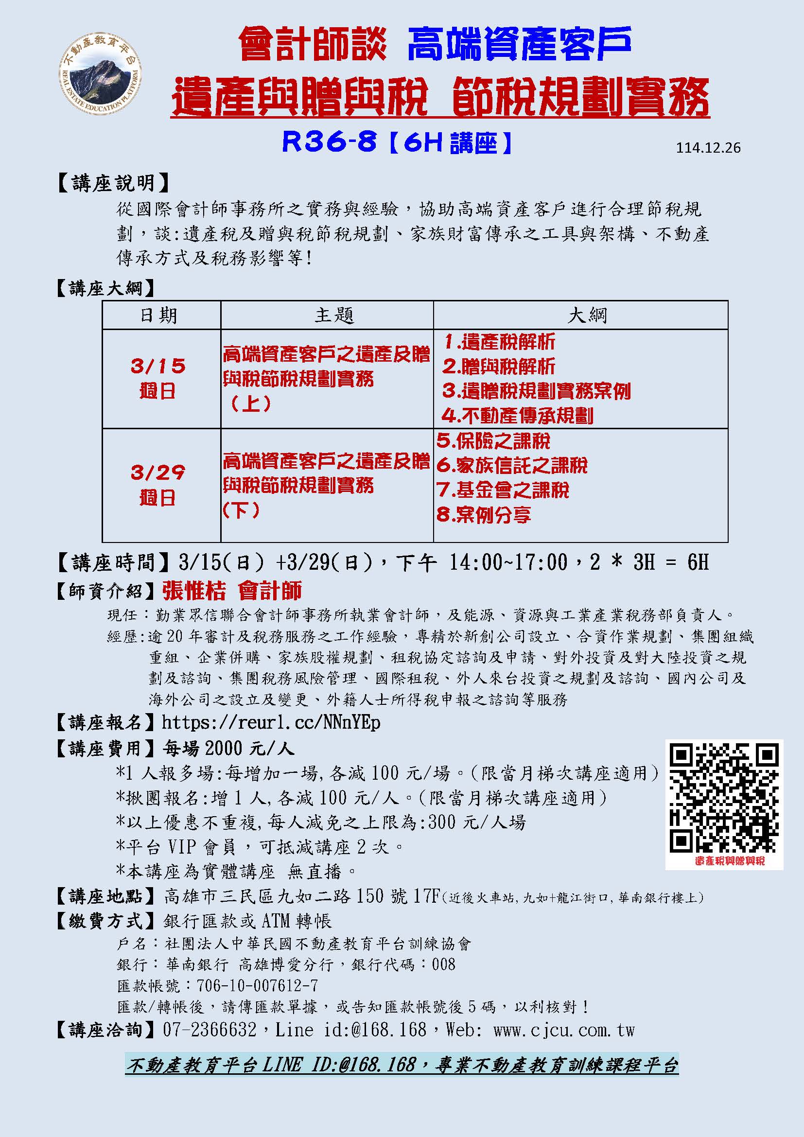 3/15下午R36遺產稅與贈與稅 節稅規劃/8期(3/15+3/29週日下午14-17)張惟桔 會計
