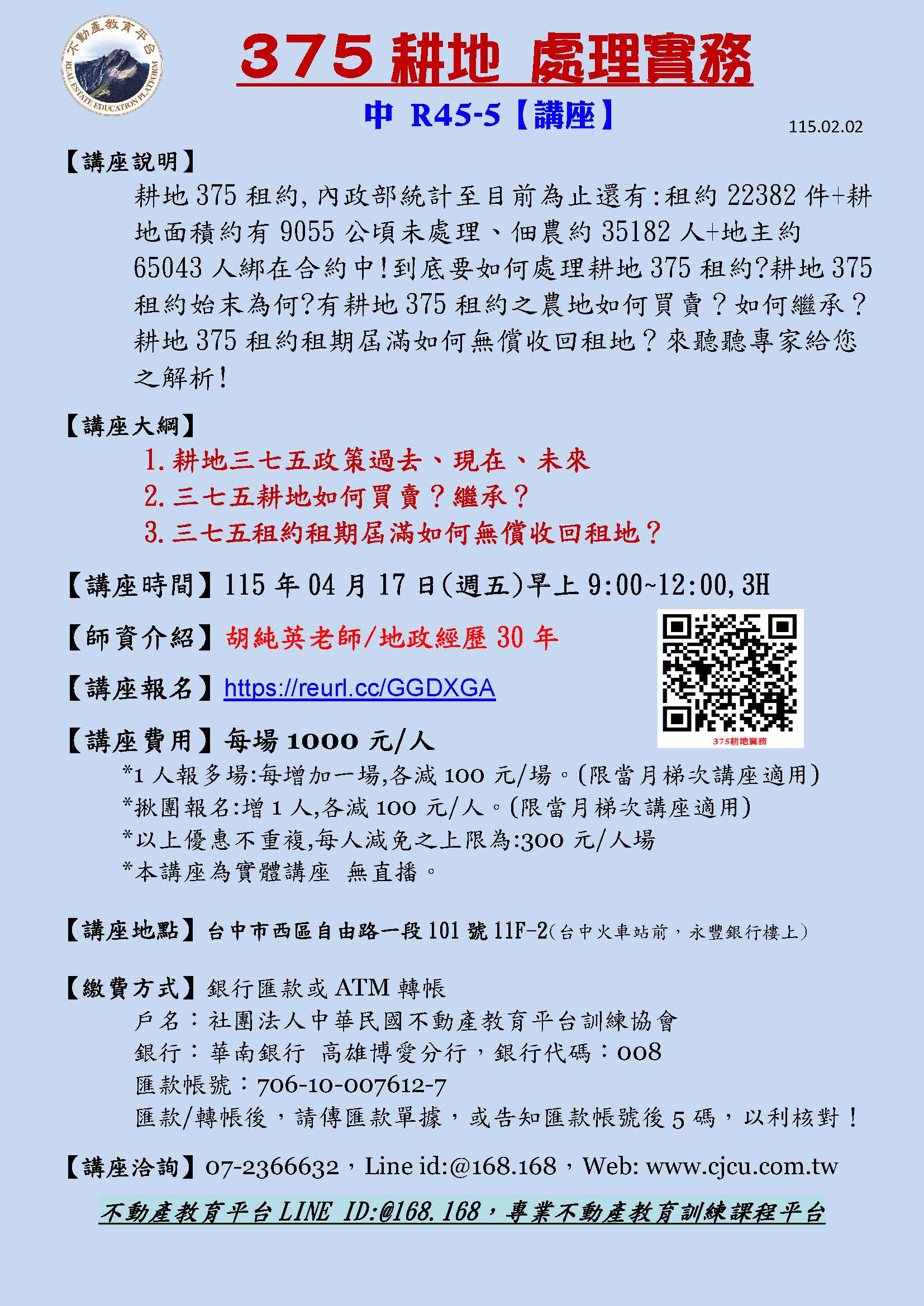 台中4/17周五-R45-375耕地處理實務/5期-胡純英老師(4/17全天)-6H