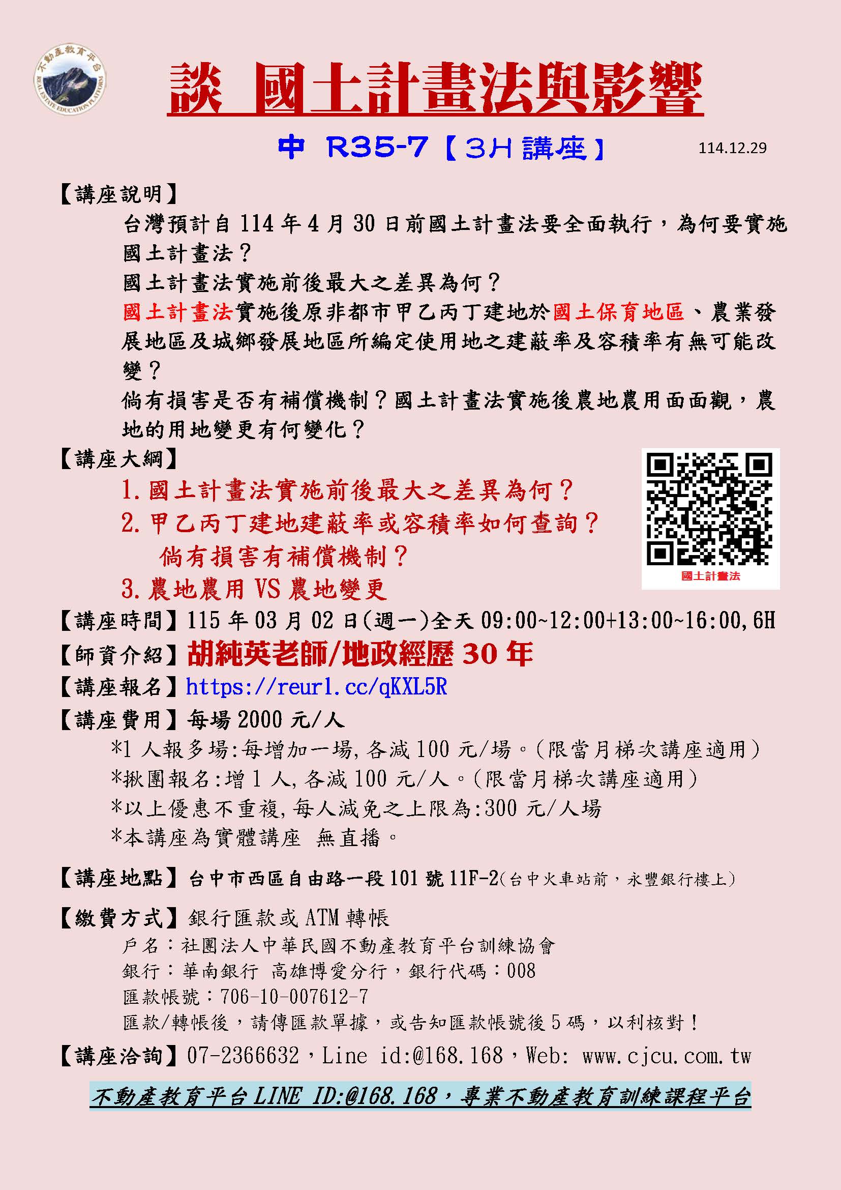 -台中3/2周一-R35談國土計畫與影響 7期-胡純英老師(3/2全天)-6H