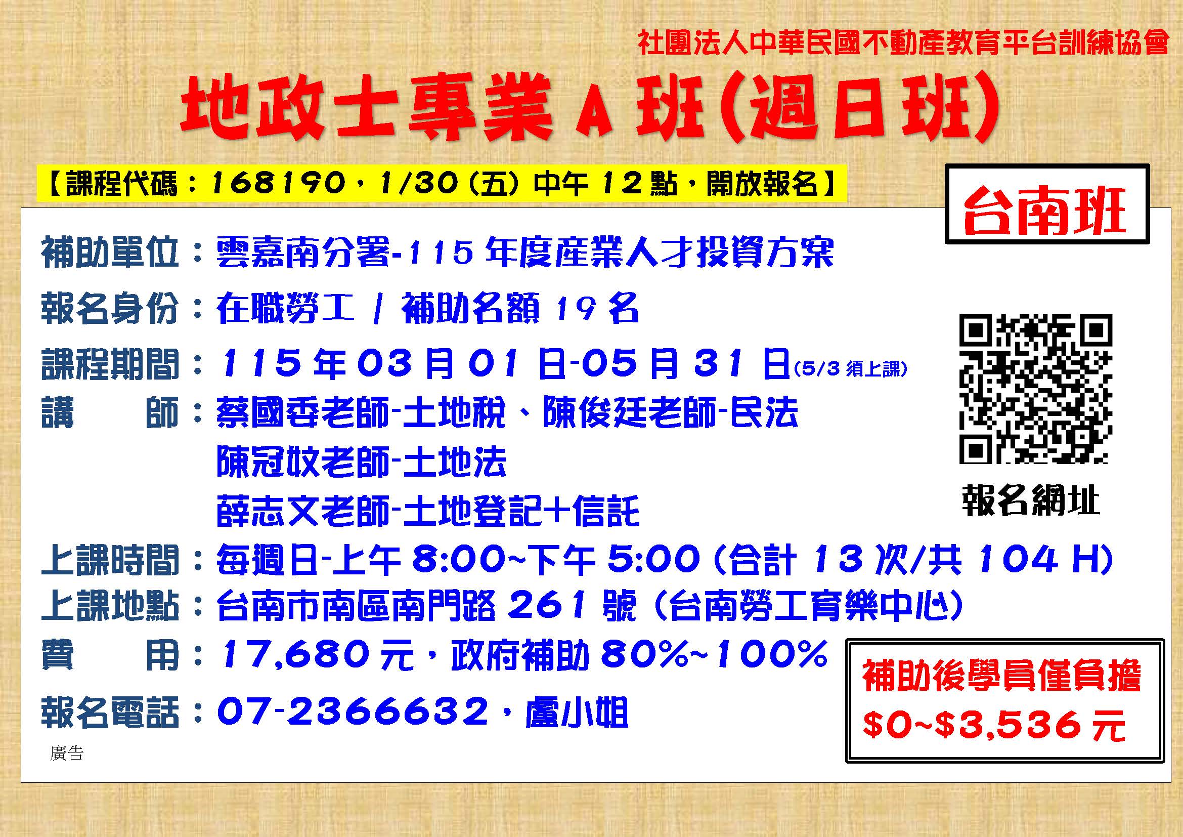 3/1台南-B253日產南-地政士專業A班104H-(週日)3/1-5/31