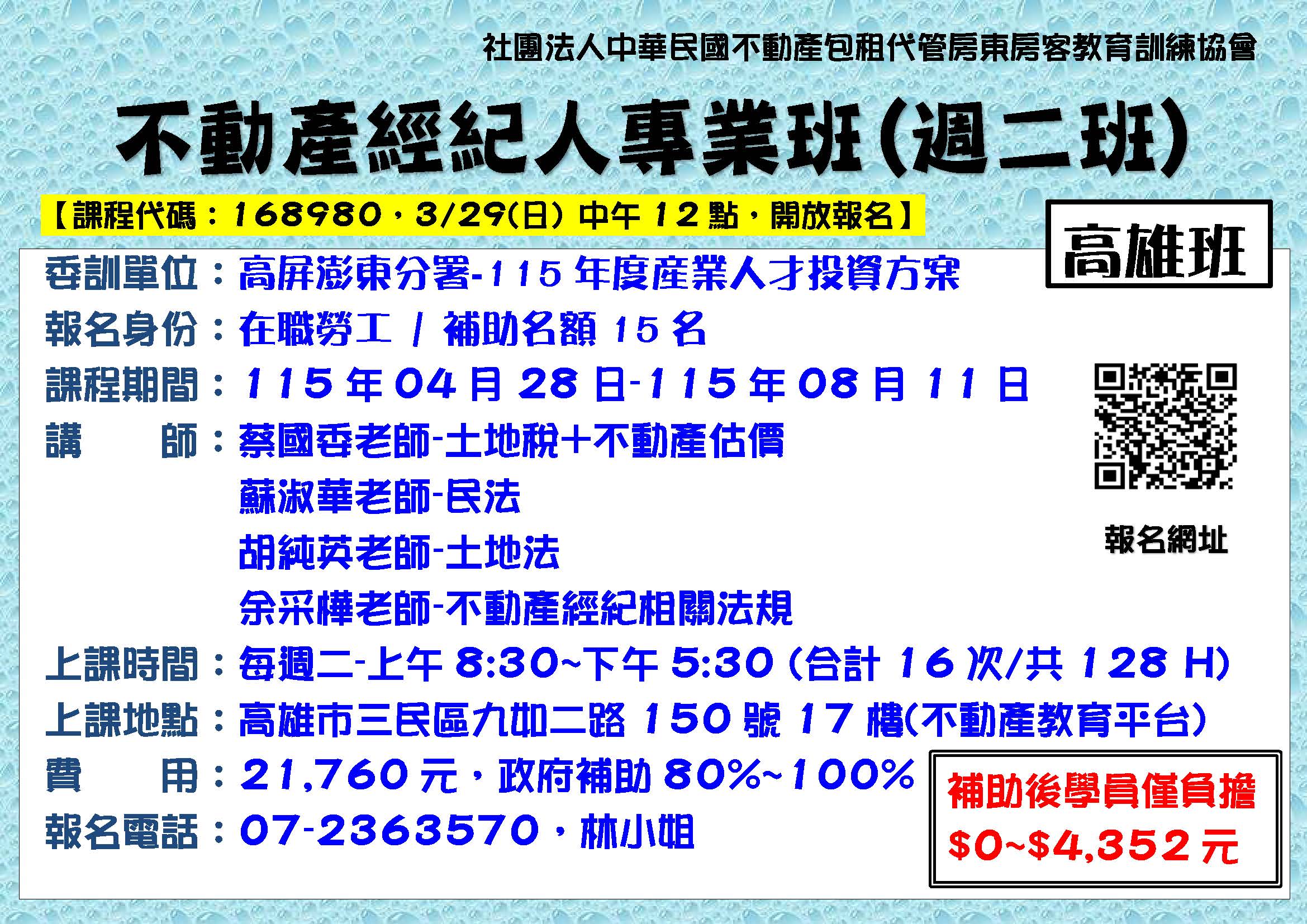 4/28高雄-B154二產高-不動產經紀人專業班(週二)4/28-8/11