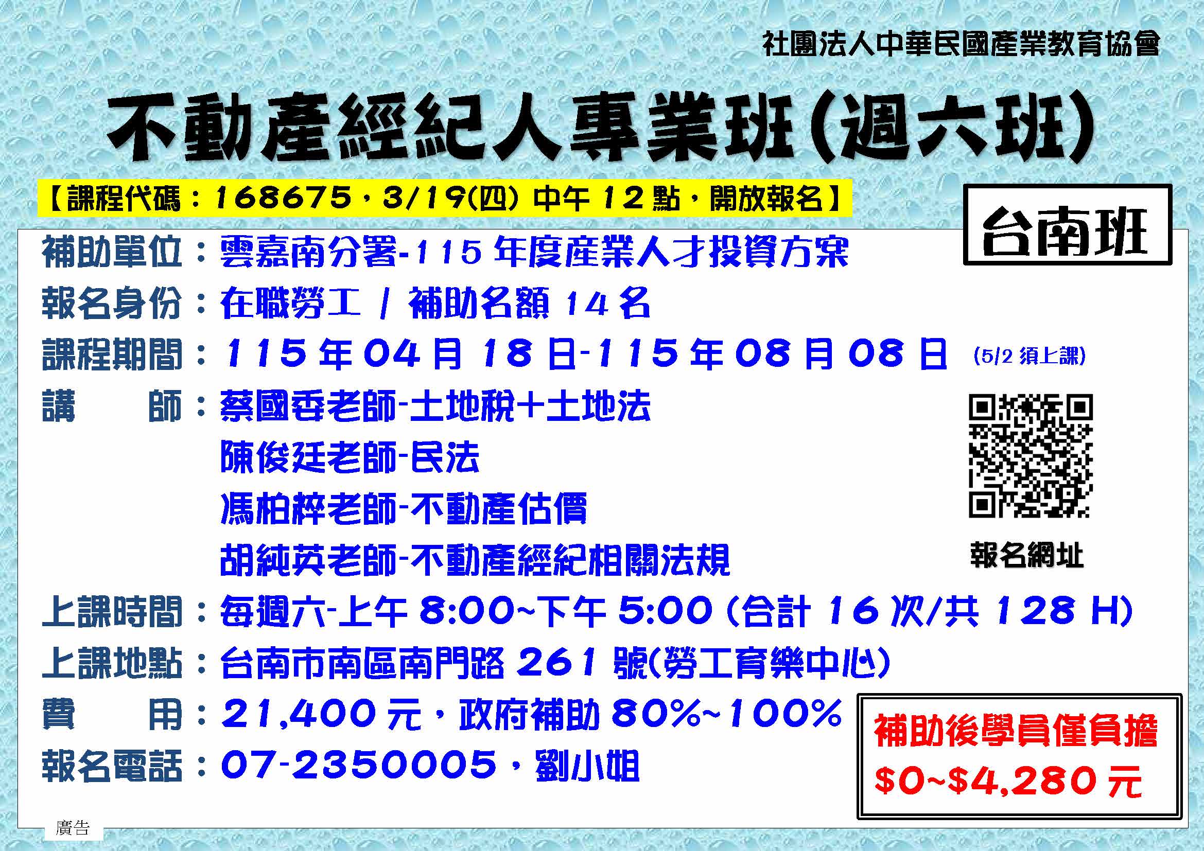 課程名稱 4/18台南-B154六產南-不動產經紀人專業班128H-(週六)4/18-8/8