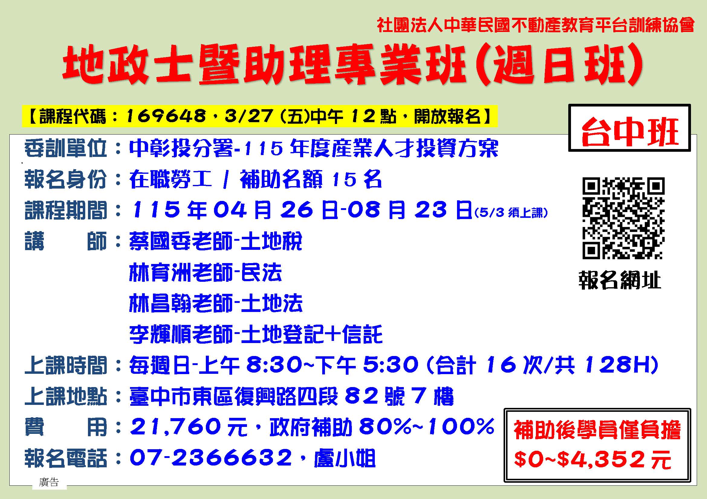 4/26台中-B254日產中-地政士暨助理專業班128H-(週日)4/26-8/23