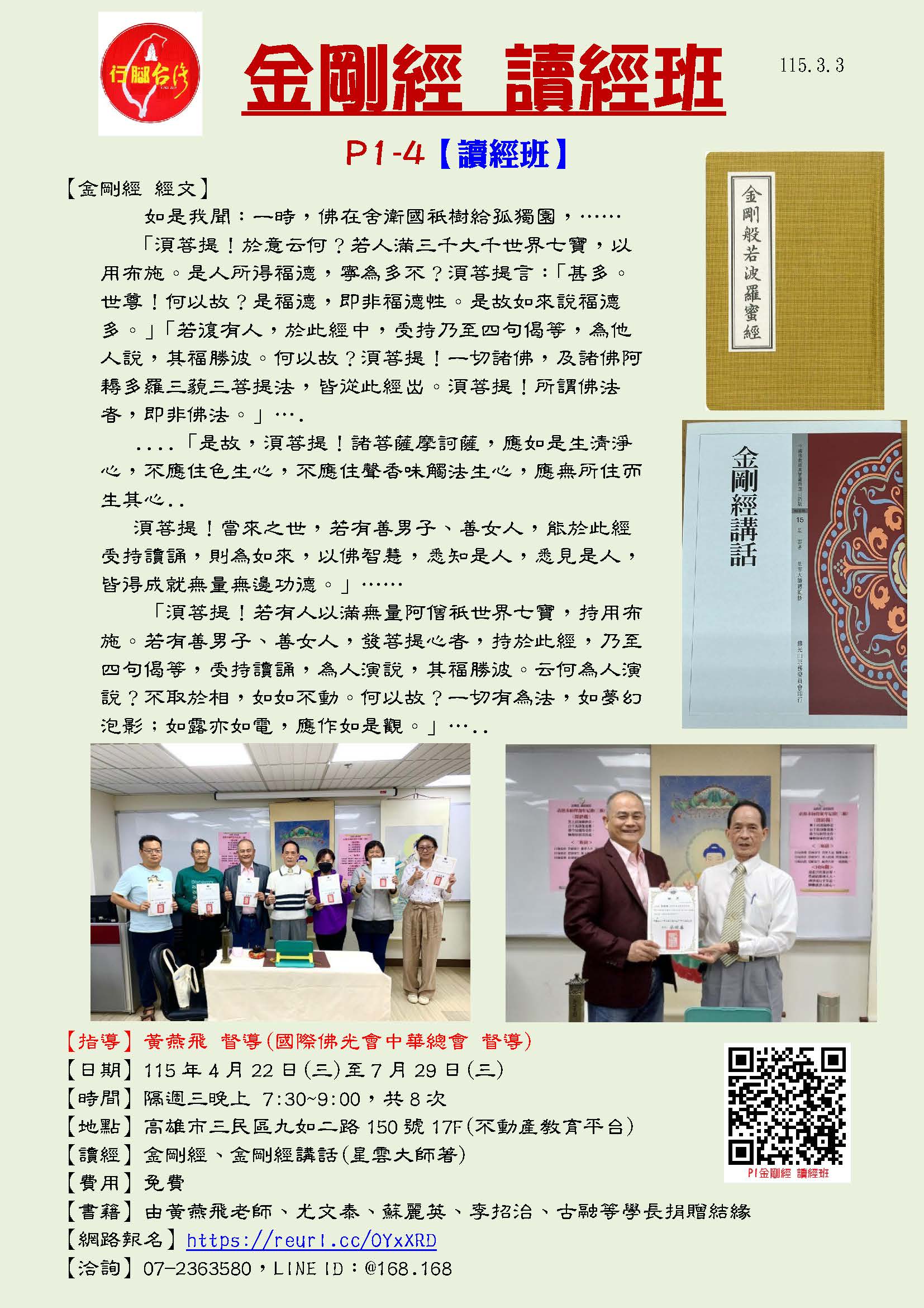 4/22(三)晚-P1金剛經 讀經班4期4/21~7/29隔週三,晚上7:30~9:00黃燕飛督導