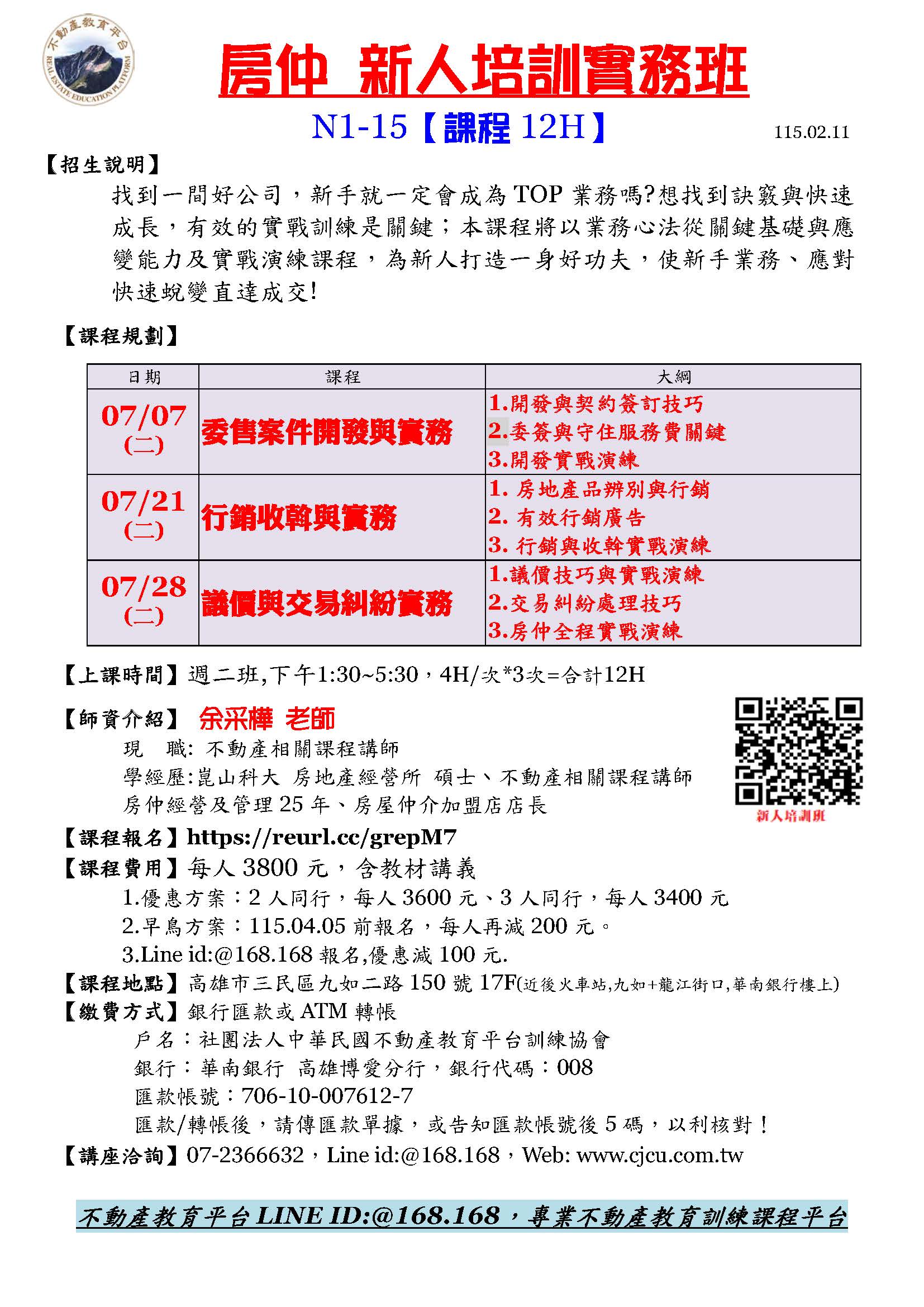 7/7下午 N1 房仲 新人培訓實務班/15期(7/7+7/21+7/28週二)余采樺老師