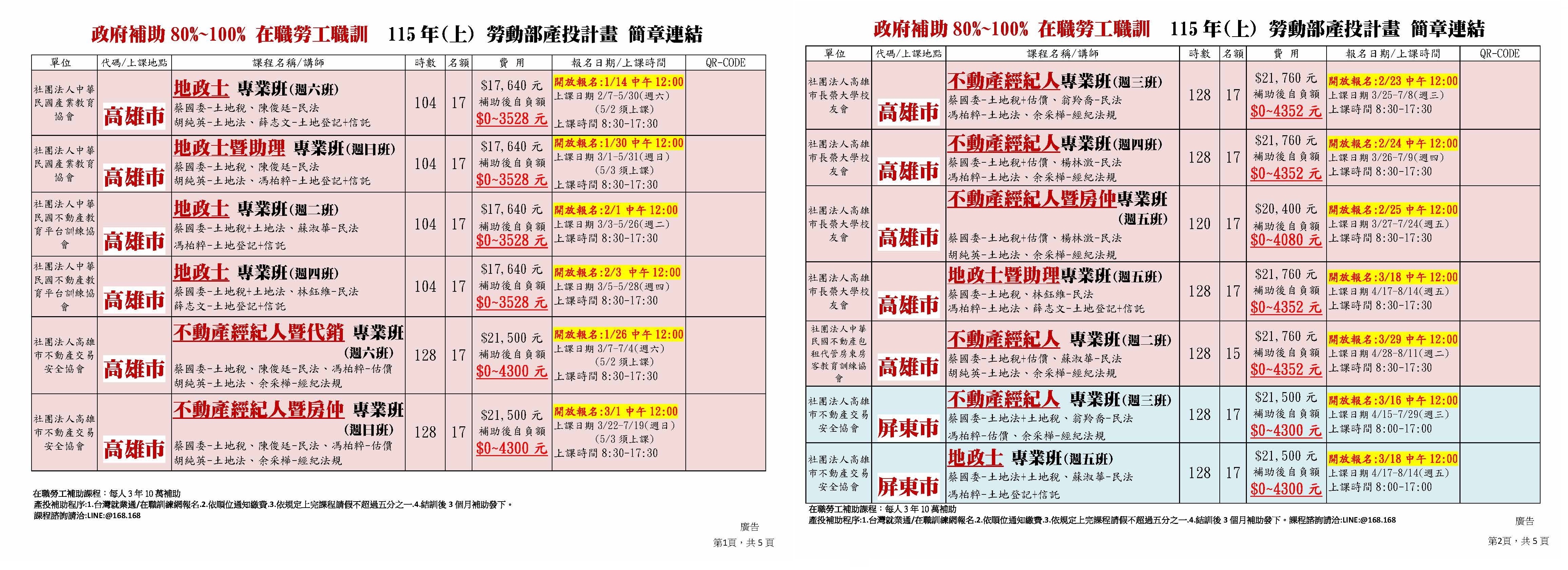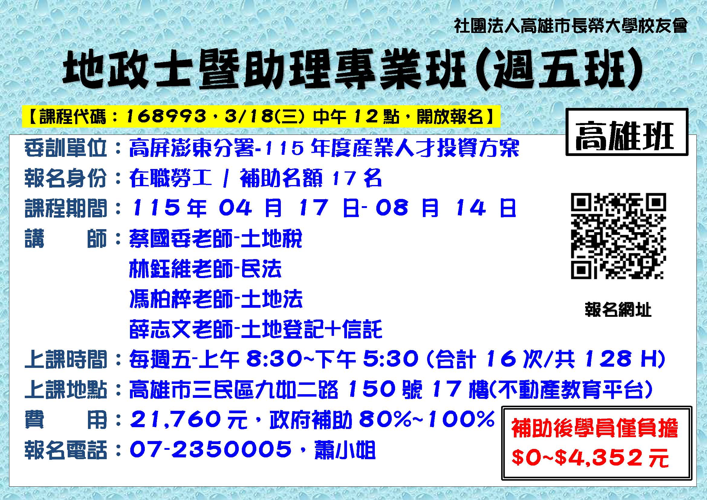 4/17高雄-B254五產高-地政士暨助理專業班128H(週五)4/17-8/14