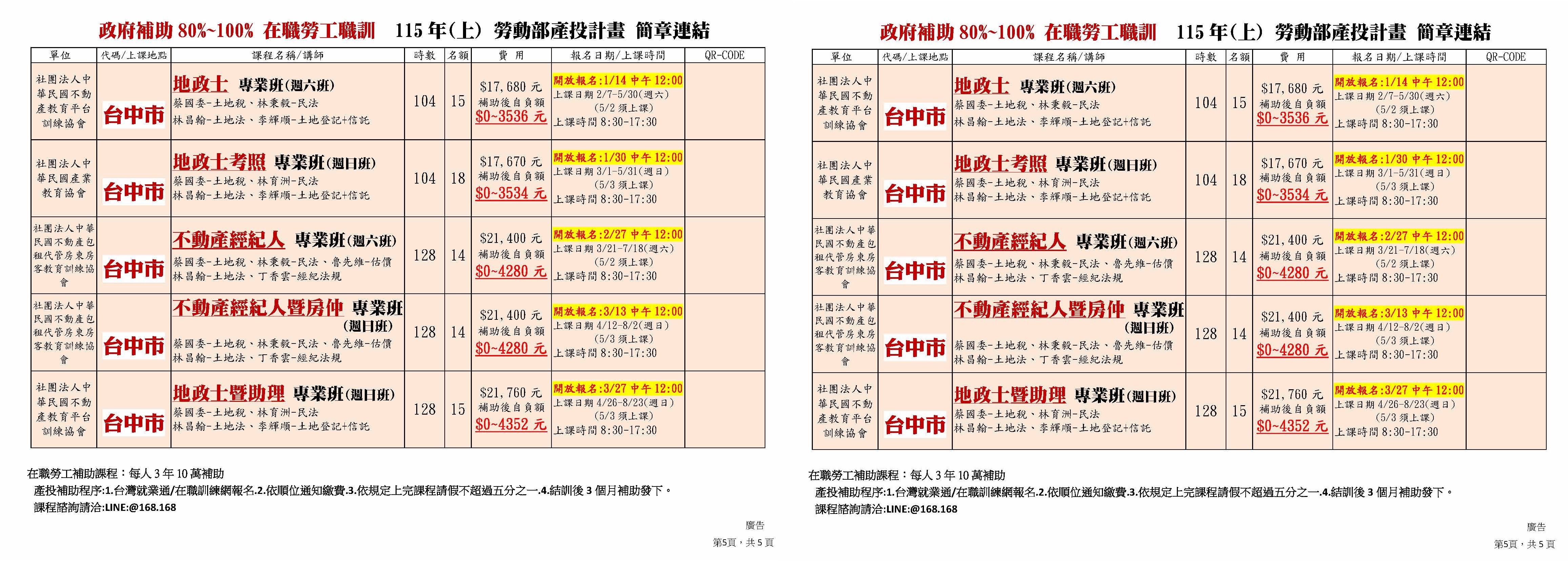台中1/18-B351【115年地政士+不動產經紀人】週日 自費考照班(115.1/11起