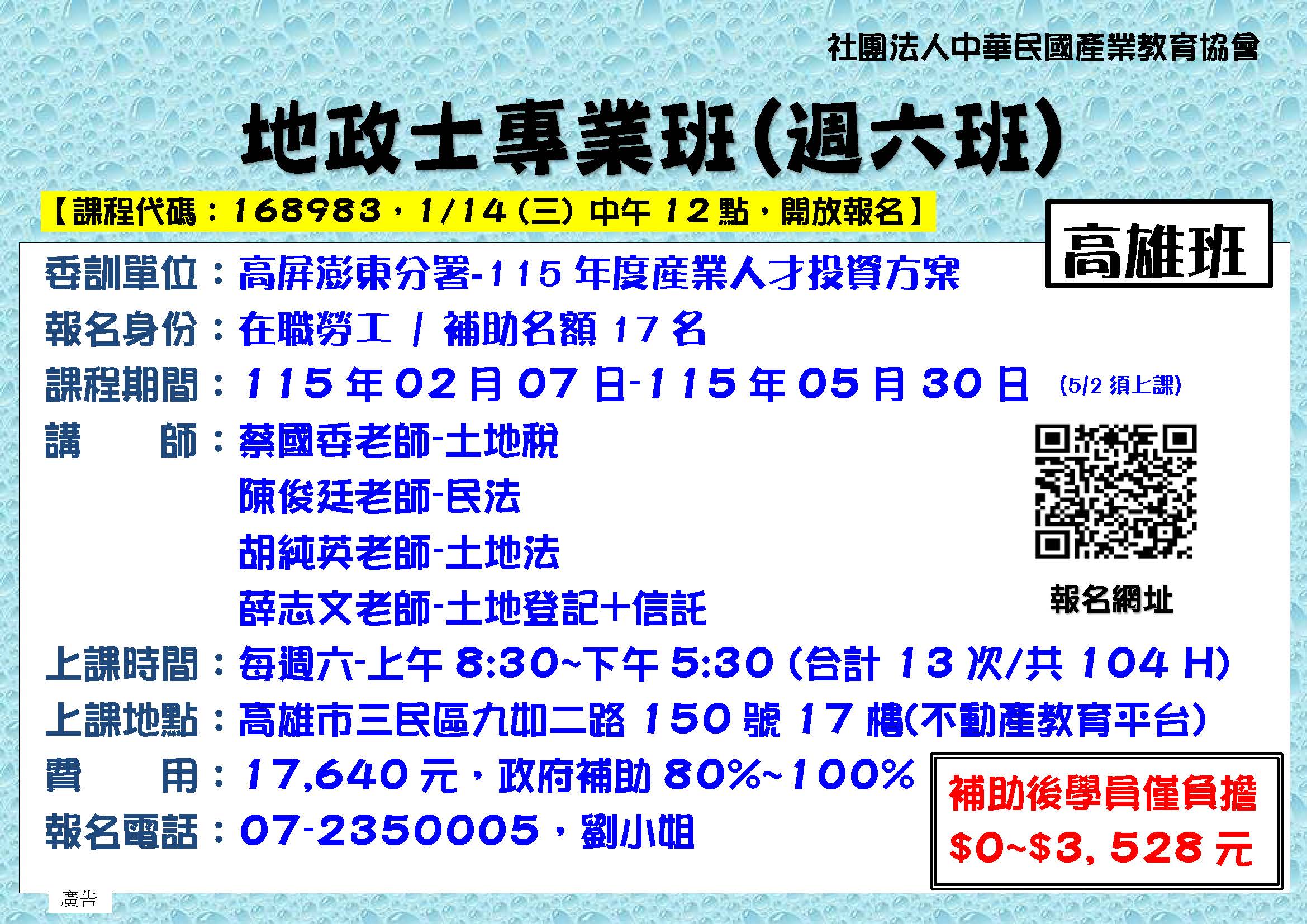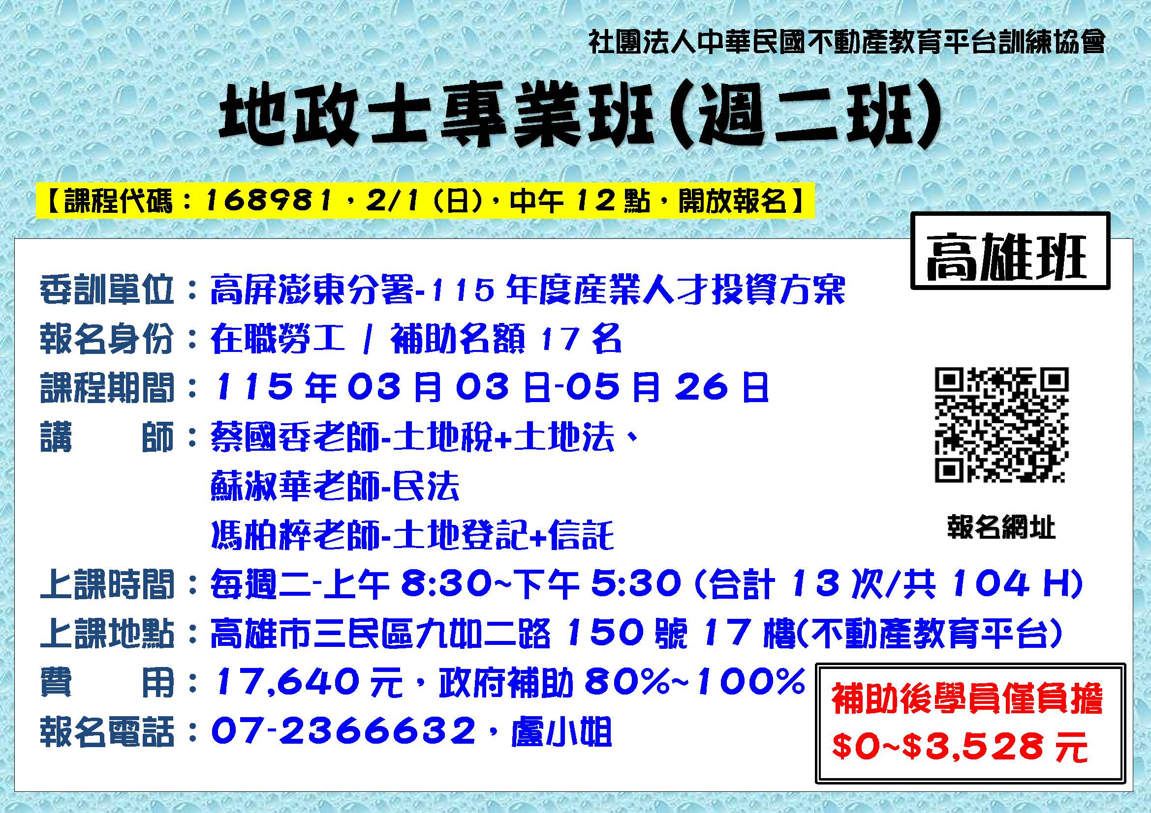 2/7高雄-B252六產高-地政士專業班104H(週六)2/7-5/30