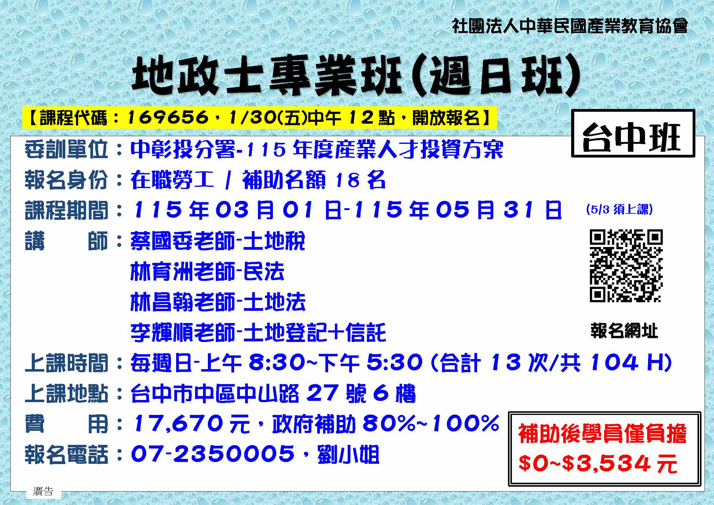2/7台中-B252六產中-地政士專業班104H(週六)2/7-5/30