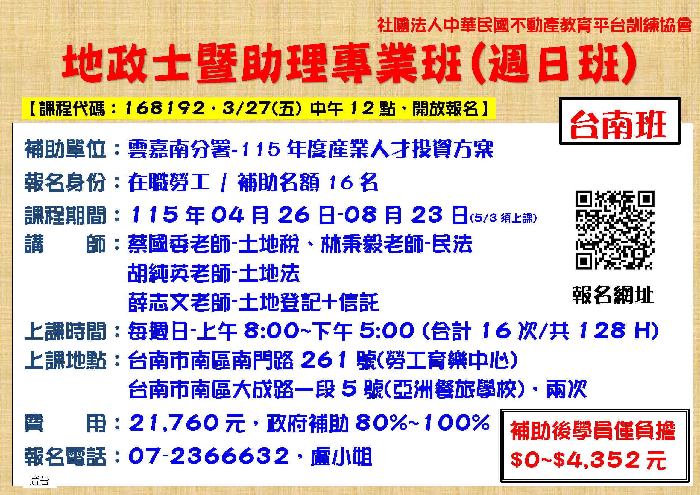 4/26台南-B254日產南-地政士暨助理專業班128H-(週日)4/26-8/23