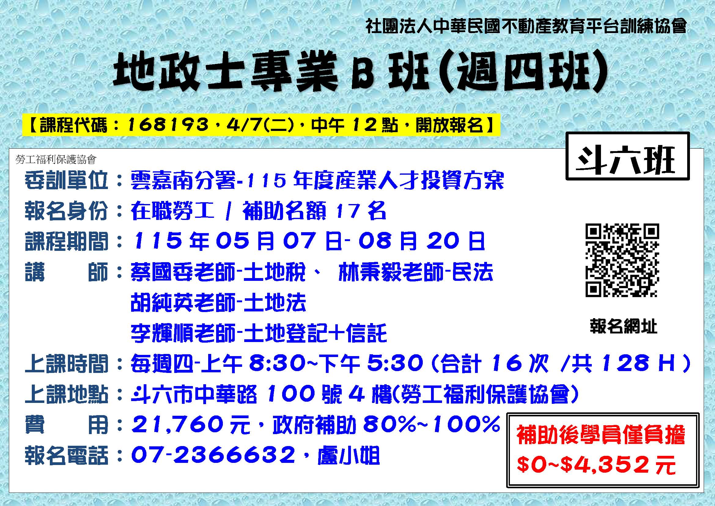 5/7斗六-B255四產雲-地政士 專業B班128H(週四)5/7-8/20