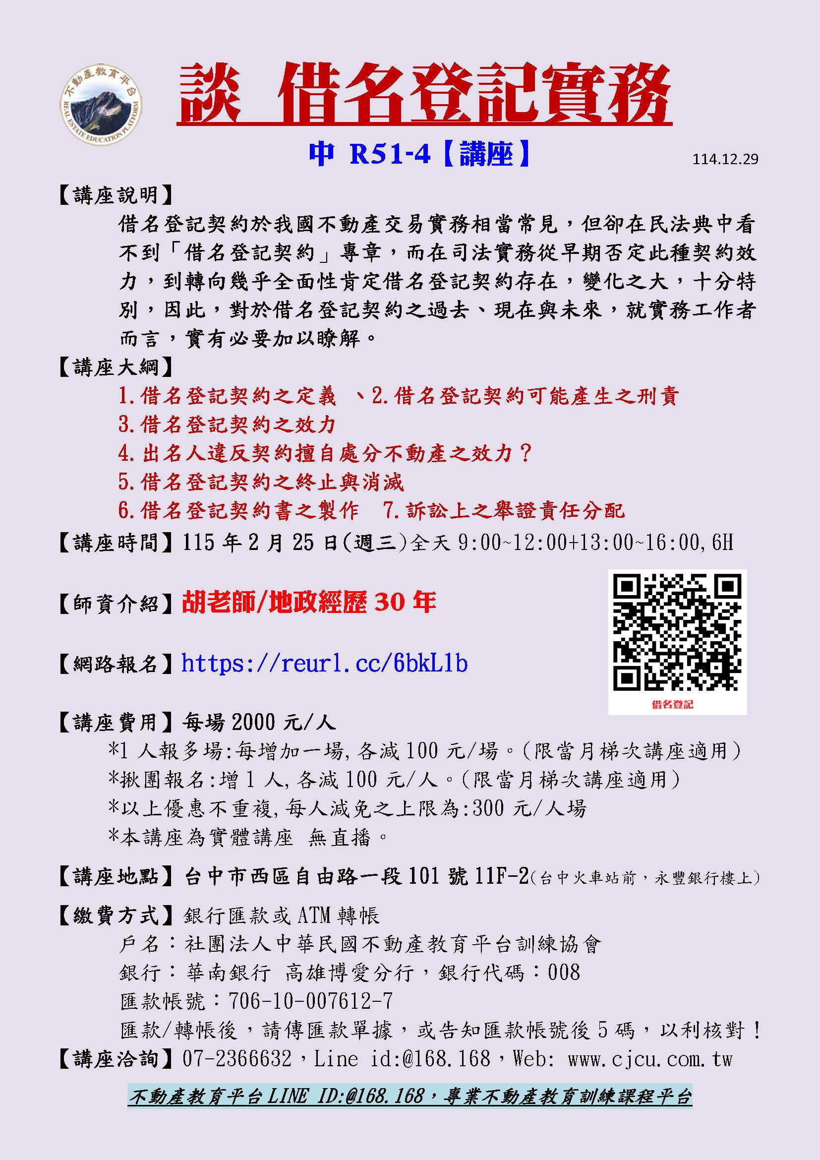 -台中2/25周三-R51借名登記實務 4期-胡純英老師(2/25全天)-6H