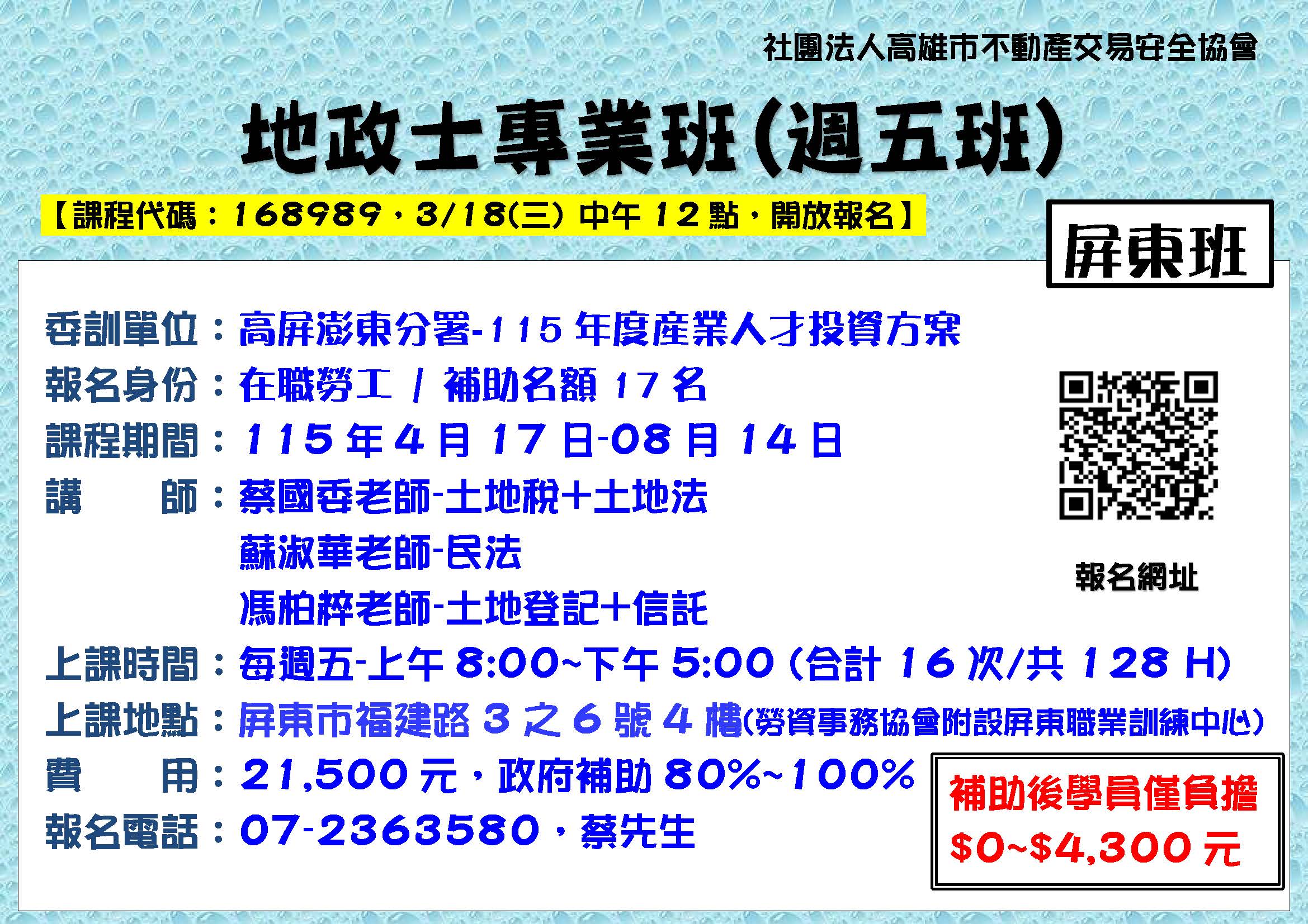 4/17屏東-B254五產屏-地政士專業班128H(週五)4/17-8/14